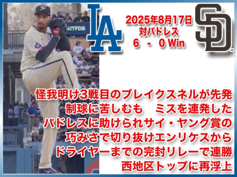 NATIONAL LEAGUE 2025年8月17日 サンディエゴパドレス戦 6-0 Win