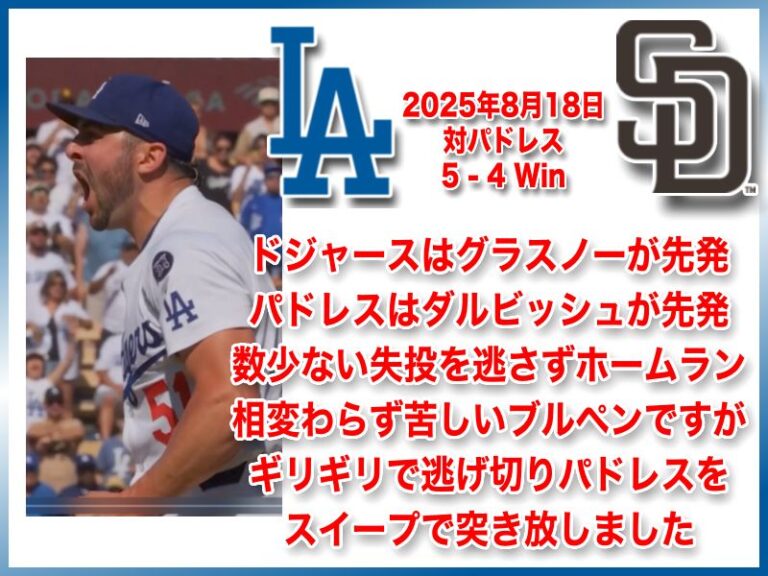 NATIONAL LEAGUE 2025年8月18日 サンディエゴパドレス戦 5-4 Win