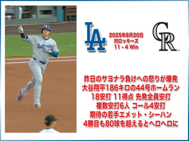 NATIONAL LEAGUE 2025年8月20日 コロラドロッキーズ戦 11-4 Win