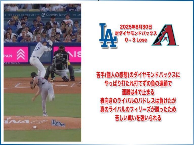 NATIONAL LEAGUE 2025年8月30日 アリゾナダイヤモンドバックス戦 0-3 Lose