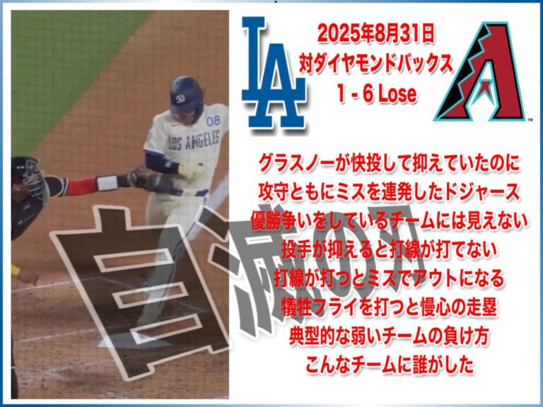 NATIONAL LEAGUE 2025年8月31日 アリゾナダイヤモンドバックス戦 1-6 Lose